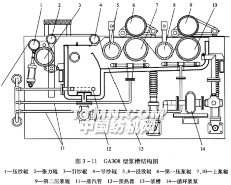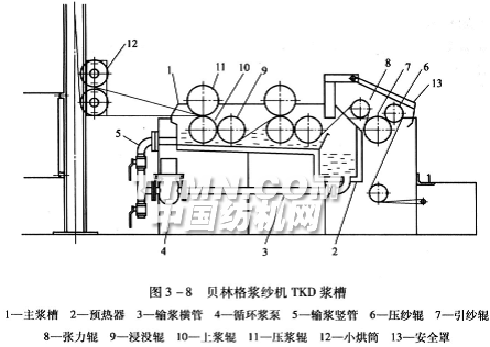 (1)使經軸退繞出來的紗片經過合并和張力調整積極地喂人漿槽,而不致消極地在漿槽潤濕狀態被上漿輥拖入,造成伸長過大。