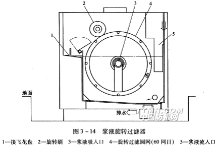 由于實際生產中循環漿液的飛花和漿渣出現較多,這里有必要介紹津田駒漿紗設備中采用的一種并不復雜的旋轉過濾裝置,如圖3一14所示。