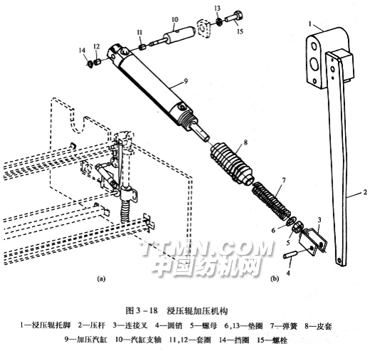 圖3一18為祖克漿紗機浸壓輥的加壓機構,(a)為安裝在漿槽墻板上的方位圖,(b)為其結構。固定在浸壓輥托腳l上的壓桿2下部通過連接叉3、圓銷4與加壓汽缸9的活塞桿相連接。加壓汽缸9的另一端則由汽缸支軸10連接在墻板上。當汽缸接受指令通入壓縮空氣時,活塞桿即拉動壓桿2,使浸壓輥托腳l向前擺動,使安裝在托腳下方掛腳中的浸壓輥對上漿輥進行側向加壓。此時受到螺母、墊圈加壓的彈簧7的壓縮,待汽缸不再通人壓縮空氣時,彈簧即恢復原有長度,推動壓桿2,使浸壓輥與上漿輥脫開。皮套8則起清潔保護作用。