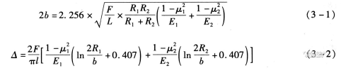 壓漿輥與上漿輥成對組合,由上漿輥摩擦傳動,如圖3—21所示。按照彈性力學關于“半平面體在邊界上受法向分布力”的分析,壓漿輥O1與上漿輥O2受壓漿力F作用時,由于彈性變形,兩輥中心距將縮短△,接觸部分由線接觸變為面接觸。接觸面作用寬度為26,接觸應力按橢圓分布。計算寬度26和壓縮量△的公式為: