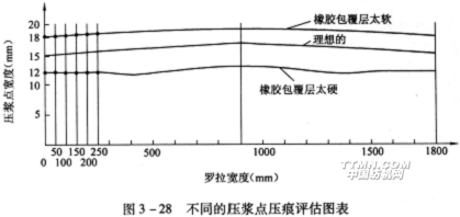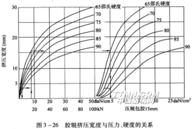 從上述分析中可知壓漿力、壓漿輥的硬度(至于上漿輥的硬度,因為是不銹鋼或邵氏A型硬度95°以上的硬橡膠包覆,其變形相對較小,可不予考慮)和擠壓寬度是三個關聯的參數。圖3—26提供的數據可作參考[15]。