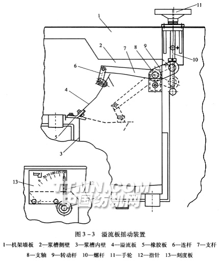 圖3—2為祖克漿紗機SD—c型漿槽,其主體部分在前方,是執行上漿的部位。后方作為輸入漿液,進行預熱和漿液循環之用,故稱為預熱器或循環漿箱。但兩部分實際連為一體,中間僅用搖動活板3隔開。搖動活板按其功能稱為溢流板,其搖動裝置如圖3—3所示。溢流板4借橡膠板5作鉸鏈,安裝在主漿槽底板后沿。其上部連接著連桿6、支桿7、支軸8。支軸8上又裝有轉動桿9。當轉動手輪ll時,螺桿10即令轉動桿轉動,通過支軸、支桿、連桿使溢流板4搖動。支軸上安裝的指針12即在刻度板13上指示主漿槽漿液面的高度,最大值為150mm,相當于200mm幅寬漿紗機的漿槽最大容積為150L。