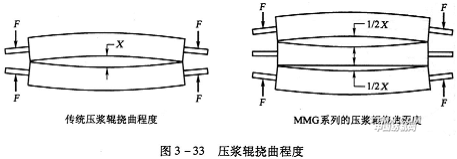 美國格里芬(Griffin)父子有限公司制造的MMG系列漿槽,如圖3—32所示。由3只直徑25.4cm(10英寸)壓漿輥,并排平放在淺漿槽中。第一壓漿輥1用不銹鋼制,是固定位置。第二壓漿輥2表面包有橡膠層,可左右移動,第三壓漿輥3也是不銹鋼制,可以向第二壓漿輥移動加壓。從經軸架退繞的紗片先經過三輥式引紗裝置5,導紗輥6,在第一、第二壓漿輥之間第一次軋漿,再浸沒到漿液中繞過第二壓漿輥的下面,在第二、第三壓漿輥之間第二次軋漿后向上方引出。這種獨特的三壓輥設計,使壓漿輥的撓曲程度可降低一半,如圖3—33所示。傳統雙軋漿輥設備上,兩端加壓形成上下輥撓曲相反,撓度X大。在MMG漿槽中因為中間的橡膠壓漿輥兩面受力平衡,不會出現撓曲,因此使軋壓位之間撓曲程度降低,降低了紗片中間部分出現較大上漿率的可能。