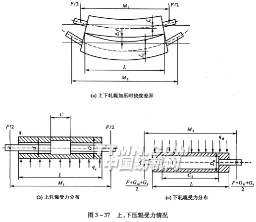 圖3—37中上軋輥(即壓漿輥)為中固輥,重量設為Gs;下軋輥(即上漿輥)為普通輥,重量設為Gxi;qF為一對軋輥的線壓力。