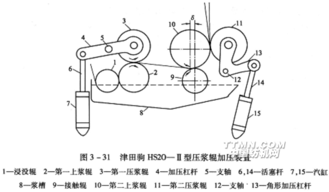 圖3—31為津田駒HS20一Ⅱ型漿紗機的漿槽加壓裝置。紗線由浸沒輥帶入漿槽液面下,經第一對上漿輥、壓漿輥軋壓上漿,其垂直加壓與一般漿紗機相似。加壓杠桿支軸5裝在機架上,汽缸進氣時推動活塞桿6帶動加壓杠桿使第一壓漿輥3產生壓漿力。