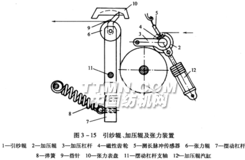 圖3一15中引紗輥具有硬橡膠包覆的表面,對紗片握持力強。其直徑與機前拖引輥一致(S系列均為212mm)。2為加壓輥裝于有支點的加壓杠桿3的頭端,通過重力緊壓在引紗輥表面,并可由加壓輥汽缸12的活塞推力脫離引紗輥。紗片繞過加壓輥及引紗輥后,具有很大的壓力和包圍角,因而能拖動后方紗片,并且引入和送出的紗片具有不同的張力,為分段調控張力創造條件。