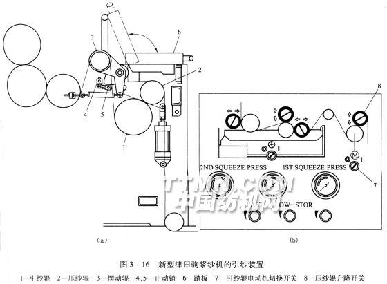 圖3一16(a)為引紗裝置結構示意,圖3—16(b)為漿槽側面的開關示意。引紗輥1用AC矢量電動機傳動,引紗輥電動機切換開關7轉向OFF即可脫開傳動。壓紗輥2通過自重加壓,可由壓紗輥升降開關8提升。擺動輥3用于吸收加減速時紗片張力的波動,其下部有彈簧提供適當的張力。兩止動銷4限制擺動輥的擺動范圍。踏板6用于處理漿槽操作。起機帶頭及處理纏紗時,限位開關控制慢車運行。