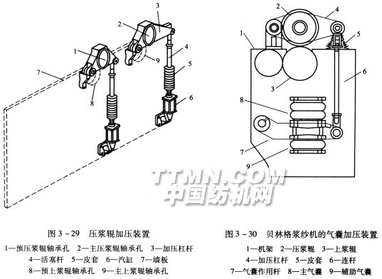 壓漿裝置的加壓機構,多數為豎式垂直加壓,如圖3—29所示。在漿槽左右墻板7上留有預、主上漿輥軸承孔8和9,供安裝上漿輥用。在其上方裝有加壓杠桿3和活塞桿4,杠桿中部留有預、主壓漿輥軸承孔1和2,供安裝壓漿輥用。杠桿后方支點固定在墻板上。杠桿前方用圓銷與活塞桿4相連,活塞桿上套著回復彈簧,外用皮套5保護。活塞汽缸下端固定在墻板上。當壓縮空氣從汽缸上端通人后,即通過加壓杠桿的移動和彈簧緩沖實現壓漿輥加壓。當壓縮空氣從汽缸下端通入釋壓后,活塞桿上的回復彈簧可平衡壓漿輥和杠桿的重力作用。