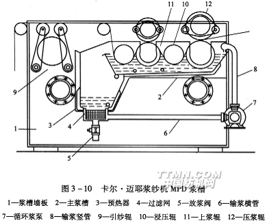 圖3-lO為卡爾·邁耶·羅塔爾漿紗機的MPD型漿槽。在預熱器底部裝有網籃式大過濾網4,可以防止進入預熱器的新漿或主漿槽回流的循環漿中的雜質、回絲流入輸漿管,堵塞輸漿泵以及造成漿污、漿斑。