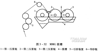 從以上各種漿槽結構圖中可知,紗片繞過引紗裝置的張力輥后,一般再繞過一根導紗輥(貝林格漿槽圖3—8中未用此導紗輥)即正式進入漿槽。在漿槽中,首先接觸的部件是浸沒(壓)輥,接著通過第一對上漿輥/壓漿輥后再與第二根浸沒(壓)輥接觸,然后進入第二對上漿輥/壓漿輥。浸沒(壓)輥的作用有兩個。