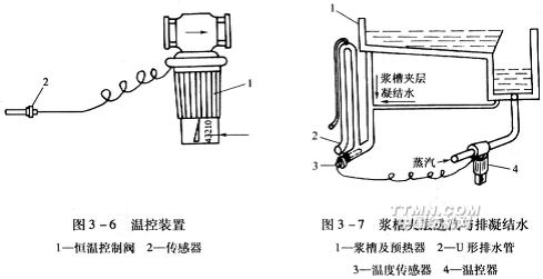 如圖3—6所示的溫控裝置,實際上是一種恒溫斷流裝置,通常校正在數字3所標的位置,當其連接的溫度傳感器檢測值高于80℃,即終止蒸汽繼續通入。圖3—7所示為間接加熱凝結水管連接情況,夾層蒸汽加熱的凝結水通向U形排水管2,溫度傳感器3即