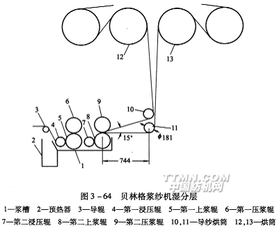 如圖3—64為貝林格漿紗機的濕分絞裝置。紗片在漿槽經第二道壓漿輥和上漿輥軋壓后,用絞線分為上下兩片,繞過導紗烘筒10和11,轉向上引至烘筒12和13,覆蓋率降低一半,再分層烘燥。