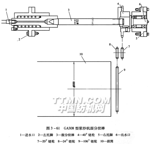 祖克漿紗機濕分絞裝置如圖3—59要是濕分絞棒轉速偏低且轉速不能隨漿紗機車速同步改變,保持適當的速差。