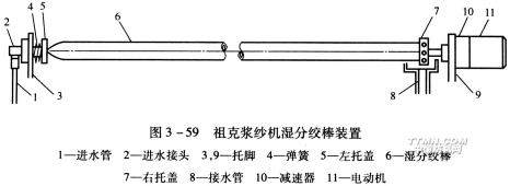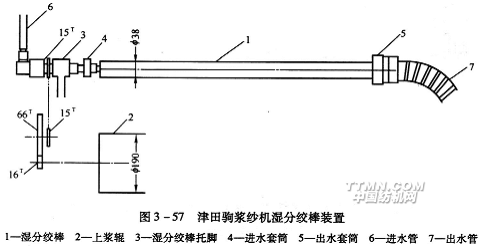 其次,如圖3—57中所示,用冷水從一端通入濕分絞棒內腔,從另一端流出。由于漿槽環境溫濕度高,棒表面的空氣會凝結成露水,紗線從棒上通過時比較潤滑,不易積漿,即使有漿膜也不易干涸,可避免造成漿斑和斷頭。