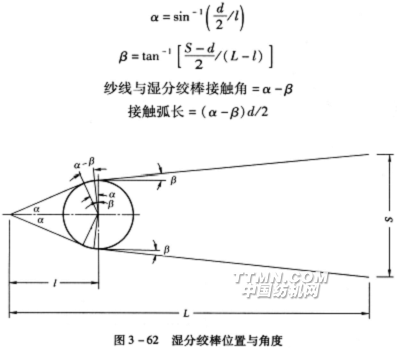 (1)分絞角度與抹紗力。如圖3—62所示,設濕分絞棒直徑為d,分絞夾角為2α,其中心距壓漿輥箝口為l,烘筒與紗線開始接觸點到壓漿輥箝口距離為L,烘筒間距為S。則由圖中各量的幾何關系可知: