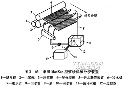 新型漿紗機注重通水溫度、流量。圖3—63為豐田。MacKee型漿紗機的濕分絞裝置,配 置專用的冷水機,溫度可保持在10℃以下。由冷水機6經進水管7、泵9將冷水送入進水聯 管裝置5,分別通入三根濕分絞棒。棒的表面凝結充裕的露水,從漿槽壓漿輥軋壓出來的紗 片經三根濕分絞棒分為三層運行毫無困難。從濕分絞棒另一端流出的水經出水管8進入循環水槽11,經過濾器12濾清后由回水管10回到冷水機,制冷降溫后重新經進水管7輸出,供再利用。