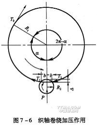 上漿紗線在漿紗機車頭由拖引輥經張力輥、導紗輥引出,在張力T0作用下自切點以半徑R1卷入織軸,經包繞角α至壓紗輥,受壓紗輥壓力p擠壓后,形成緊密的卷繞結構。如圖7—6所示,先以單壓紗輥作簡單示意。設紗片進出擠壓區的張力分別為T1和T2。T0是卷繞機構設定的主動力,是紗片通過張力輥與汽缸氣壓平衡所決定的。由T0張緊的紗片被轉動的織軸包繞,與皮帶輪傳動類似,有一定的伸長和彈性滑移,因而應用歐拉公式: