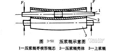 為克服上漿率橫向不勻,對(duì)上漿輥的材質(zhì)提出了較高的要求,并且輥芯被設(shè)計(jì)成棗核形,見(jiàn)圖3-50所示(為說(shuō)明設(shè)計(jì)原理,在圖中對(duì)施加高壓時(shí)上漿輥和壓漿輥的彎曲程度作了夸張),當(dāng)壓漿輥兩端被施加高壓力時(shí),由于棗核形輥芯的作用,壓漿輥殼體和上漿輥共同發(fā)生微小的彎曲變形,使經(jīng)紗片上漿率能保持橫向均勻。