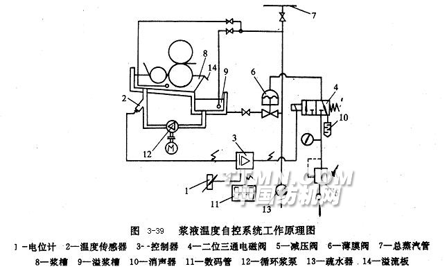 漿槽蒸汽加熱采取直熱式和間熱式兩種,間熱式蒸汽加熱的漿液溫度自動(dòng)控制原理如圖3-39所示。漿液溫度由電位計(jì)1進(jìn)行預(yù)設(shè)定,溫度傳感器2把當(dāng)前漿液溫度轉(zhuǎn)換成電壓信號(hào)輸入到控制器3,并與電位計(jì)1的預(yù)設(shè)定電位進(jìn)行比較。然后,由控制3發(fā)出控制信
