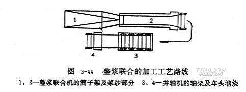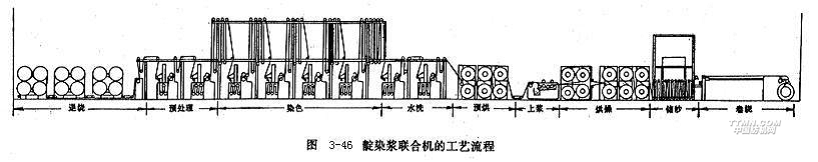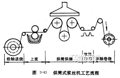 由于流程短并且經(jīng)絲在烘燥前后均不受分絞作用,所以經(jīng)絲斷頭少,排列均勻、整齊,伸長(zhǎng)也小。其缺點(diǎn)是經(jīng)絲之間產(chǎn)生粘連,因此局限于上漿率不高、織物經(jīng)密較低、漿槽內(nèi)覆蓋系數(shù)較小的經(jīng)絲上漿,上漿后經(jīng)絲之間的輕度粘連不至影響織機(jī)上經(jīng)絲的清晰開(kāi)口。為減少長(zhǎng)絲之間的粘連現(xiàn)象,提高漿膜完整性,烘燥裝置亦可采用先熱風(fēng)后烘筒、經(jīng)絲分層的烘燥方式。無(wú)捻長(zhǎng)絲(如錦綸,滌綸無(wú)捻長(zhǎng)絲)的捻度極小(0.1~0.2捻/m左右),纖維之間集束性很差,而且一般用于高經(jīng)密織物的織造,為此上漿時(shí)要特別加強(qiáng)纖維的集束性,避免長(zhǎng)絲的相互粘連。通常,無(wú)捻長(zhǎng)絲的上漿加工采取整漿聯(lián)合的工藝路線(xiàn)見(jiàn)圖3-44所示,這是一種兩階段的加工系統(tǒng)。