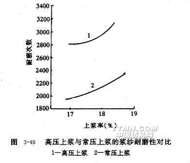 圖3-49表明,當(dāng)漿液總固體率達(dá)以一定數(shù)值之后,繼續(xù)提高總固體率對(duì)Q值降低的作用不明顯,不可能進(jìn)一步減少漿紗能耗、提高漿紗速度。這說(shuō)明漿液總固體率的選擇應(yīng)適當(dāng),不宜過(guò)高。有觀(guān)點(diǎn)認(rèn)為,過(guò)高的漿液總固體率必然造成過(guò)高的壓漿輥壓力,以致紗線(xiàn)形狀被壓扁,并且紗線(xiàn)上漿不勻,還可能損傷壓漿輥。沿壓漿輥長(zhǎng)度方向,單位長(zhǎng)度上合理的高壓上漿壓漿力為98~294N/cm。