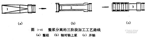 在兩階段系統(tǒng)中,由于整經(jīng)斷頭引起的停車(chē)會(huì)影響漿紗質(zhì)量、降低設(shè)備效率,因此目前亦有使用整漿分離的三階段加工工藝路線(xiàn),見(jiàn)圖3-45所示,經(jīng)絲的加工分整經(jīng)、軸對(duì)軸上漿、并軸三階段完成。與兩段加工工藝路線(xiàn)相比,三階段加工工藝路線(xiàn)流程長(zhǎng)、占用機(jī)臺(tái)多、生產(chǎn)成本高。鑒于國(guó)產(chǎn)長(zhǎng)絲的質(zhì)量,為避免整經(jīng)斷頭的停車(chē)影響漿紗質(zhì)量,國(guó)內(nèi)普通采用三階段加工工藝路線(xiàn)。