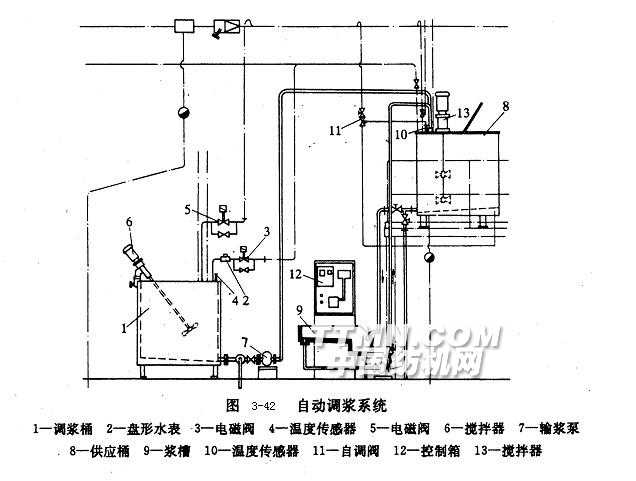 典型的自動(dòng)調(diào)漿系統(tǒng)如圖3-42所示。調(diào)漿桶1的供水和供汽系統(tǒng)分別由水管、盤(pán)形水表2、電磁閥3和汽管、溫度傳感器4、電磁閥5組成。攪拌器6的攪拌速度可從350~1700r/min無(wú)級(jí)調(diào)速。在人工配料及裝料之后,計(jì)算機(jī)根據(jù)預(yù)設(shè)程序定量加水,并控制完成各項(xiàng)調(diào)漿操作,漿液調(diào)制完畢后,輸漿泵7自動(dòng)開(kāi)啟,漿液被輸入供應(yīng)桶8中,開(kāi)始對(duì)漿槽9供漿。供應(yīng)桶的攪拌速度由計(jì)算機(jī)控制。以溫度傳感器10、自調(diào)閥11及汽管所組成的供汽系統(tǒng),在計(jì)算機(jī)控制下改變供應(yīng)桶夾層內(nèi)蒸汽輸入量,維持預(yù)定的供漿溫度。各項(xiàng)調(diào)漿參數(shù)的設(shè)定旋鈕、控制按鈕和流程顯示均集中安裝在控制箱12的面板上,既方便操作,又能對(duì)調(diào)漿過(guò)程一目了然。