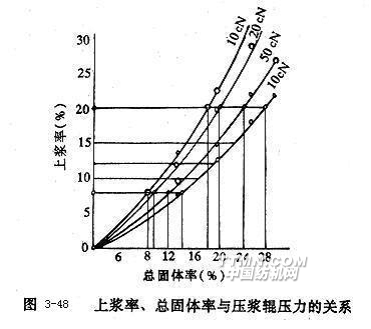 漿液總固體率的增加使?jié){紗速度得以增加,同時(shí)也導(dǎo)致了漿液粘度的提高,從而對(duì)漿紗上漿率和漿液的被覆與浸透程度產(chǎn)生不良影響。為達(dá)到適當(dāng)?shù)纳蠞{率和合理的被覆與浸透程度,必須增加壓漿輥壓力,采用中壓或高壓上漿。有關(guān)壓漿輥壓力與上漿質(zhì)量的關(guān)系已經(jīng)在“上漿與濕分絞”一節(jié)中作了詳盡介紹。實(shí)測(cè)的上漿率,總固體率與壓漿輥壓力三者關(guān)系如圖3-48所示。曲線(xiàn)表明,當(dāng)漿液總固體率增加,為保證漿紗上漿率穩(wěn)