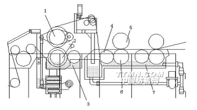 1-上壓輥2-下壓輥3-預(yù)濕槽4-浸沒(méi)輥5-壓漿輥6-上漿輥7-漿槽