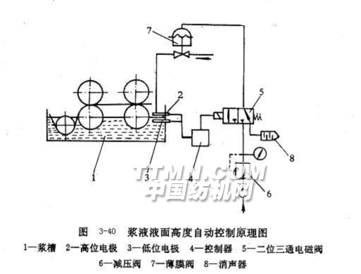 漿紗過(guò)程的自動(dòng)控制主要包括漿紗機(jī)上經(jīng)紗張力、壓漿輥壓力、漿液溫度、漿液液面高度、烘筒及熱風(fēng)溫度、漿紗回潮率、上漿率等工藝參數(shù)或質(zhì)量指標(biāo)的自動(dòng)控制以及調(diào)漿系統(tǒng)的自動(dòng)控制。經(jīng)紗張力自動(dòng)控制已在第三節(jié)“上漿”一節(jié)中作了詳細(xì)介紹,下面就另一些控制項(xiàng)目簡(jiǎn)單介紹。