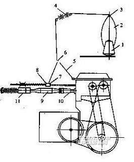 1-筒子2-緯紗3-導紗眼4-張力裝置5-斷頭自停探測桿6-導紗磁眼