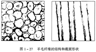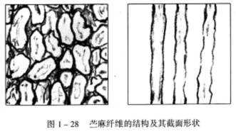 我國是產麻大國,因而麻類資源十分豐富,有黃麻、亞麻、苧麻及羅布麻等。目前常用于轉杯紡的麻纖維,主要是苧麻,纖維直徑在18—25μm,其結構與截面形狀如圖1—28所示。由于苧麻纖維比較粗硬、剛性大、表面光滑,因而,在加捻時會給捻回的形成和傳遞造成不利影響;又因為苧麻纖維的脆性大、易折斷,紡紗時斷頭率較高。轉杯紡所使用的苧麻原料多是精落麻,其長短差異大