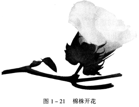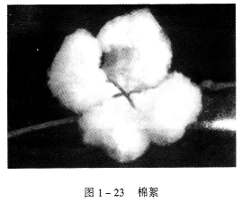 棉農培植的棉株生長后開花,如圖1—21所示,然后結成棉鈴(桃),如圖1—22所示,棉鈴成熟后自然綻放出棉絮,如圖1—23所示,棉絮由棉纖維集結組合而成。實際上,棉纖維是由包裹在棉籽表皮的細胞發育成熟伸長后而形成的。
