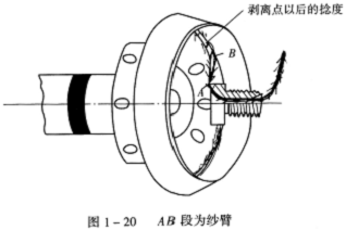 剝取階段是凝棉槽內的須條經紗臂牽引而脫離凝棉槽,紗臂在阻捻頭的作用下已獲得捻度(回),但這時是假捻作用。當然,在剝離點之后也有部分捻度滲透到須條上。圖1—20中/AB段為紗臂,從剝離點到阻捻頭這段紗條上產生的是假捻,其作用是增加須條的動態強力,防止在這段紗條上產生斷頭。轉杯紡產生的斷頭有90%以上發生在剝離點至阻捻頭這段須條上(即紗臂上)。