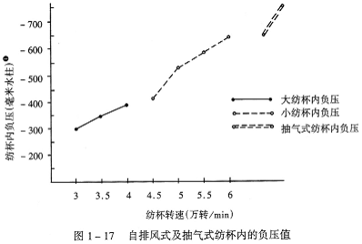 在自排風式轉杯紡紗機中,由于高速旋轉的紡杯把杯中原有的空氣從底部的排氣孔排出以后,紡杯內便產生負壓(真空度),因紡杯的直徑有大小之分,轉速有快慢差別,并且又受紡紗器密封性能好壞的影響,因此,紡杯內負壓高低存在著較大的差別。圖1—17所示為自排風式及抽氣式紡杯內的負壓值。