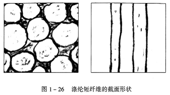 滌綸是諸多化學纖維中的一種,它由噴絲頭噴成滌綸長絲,然后再根據需要切成不同長度的滌綸短纖維,其截面形狀如圖1—26所示。適合轉杯紡加工的滌綸短纖維的線密度在1.47~2dtex,長度為38mm。由于滌綸的纖維長短一致且不含雜質和灰塵,并且在出廠前都施有油脂,起軟化潤滑作用,因此,滌綸是化學纖維中可紡性較好的一種纖維。就紡紗而言,滌綸也存在一些缺點和不足之處,如滌綸在紡紗過程中與高速旋轉機件發生摩擦時會產生靜電,靜電荷之間的吸附與排斥作用將影響纖維間的正常輸送、轉移及并合作用。并且滌綸的剛性較大,表面又含有油脂,給捻回(度)的形成和傳遞造成一定困難。還因化學纖維的透氣性能差,在作為服裝面料用紗時,滌綸一般多與棉纖維進行混紡,即滌棉紗。