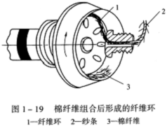 原先附著在分梳輥齒端的棉纖維,在負壓氣流的吸引下,便脫離分梳輥齒尖的控制,通過輸棉通道和隔離盤進入紡杯。棉纖維在紡杯高速旋轉時所產生的離心力及負壓氣流的共同作用下,沿著紡杯的滑移面進入凝棉槽,由于棉纖維的凝聚與并合作用而形成纖維環,跟隨紡杯一起旋轉。