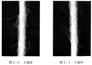 由于轉(zhuǎn)杯紡加捻器(紡杯)是按順時(shí)針?lè)较蛐D(zhuǎn),因此所紡出的紗條稱為正捻紗。若仔細(xì)觀察組成紗條棉纖維的排列方向,與英文字母Z的中間部分方向一致,如圖2—2所示,在棉紡行業(yè)中,把這種捻向的紗線稱為Z捻紗。目前,Z捻紗在轉(zhuǎn)杯紡紗生產(chǎn)中還是一枝獨(dú)秀,占有統(tǒng)治地位。隨著轉(zhuǎn)杯紗用途的不斷拓寬,織造工藝不斷有新發(fā)展,對(duì)反捻紗的需求量也將逐漸增多。
