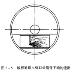 ②輸棉通道入棉口所鑲嵌鋼針的下端若存在縫隙(圖3—5)或橡膠密封圈有破損、粘接處出現(xiàn)毛刺均會產(chǎn)生掛花現(xiàn)象。當(dāng)所掛的花被負(fù)壓氣流吸進(jìn)紡杯后,即加捻在紗條中而形成粗節(jié)。縫隙或毛刺越大,所產(chǎn)生的粗節(jié)也越大,產(chǎn)生粗節(jié)的機(jī)會也越多。