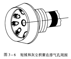 ②若棉條的回潮率太大、生產(chǎn)車間相對濕度太高,從棉條中被分離出來的短絨和灰塵就不容易被及時排除而聚集在紡杯的排氣孔周圍,如圖3—6所示。聚集的短絨一方面影響紡杯對氣流的排泄作用,降低了紡杯內(nèi)的負(fù)壓,為粗節(jié)形成留下便利條件;另一方面聚集在排氣孔周圍的短絨和灰塵,容易掉落在紡杯凝棉槽內(nèi)而被加捻在紗條中形成粗節(jié)。