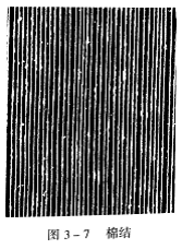 所謂棉結(jié)就是在原棉中或在紡紗過程中,有少量棉纖維纏繞糾結(jié)后未被分解、梳理開,形成小的團(tuán)狀或粒狀而被加捻在紗條中。棉結(jié)大多數(shù)都附著在紗條的表面,如圖3—7所示。產(chǎn)生棉結(jié)的原因有: