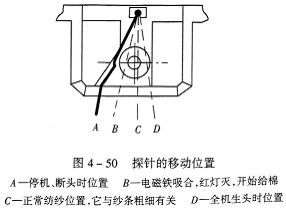 紗條接頭或生頭時,探針應從上罩殼的左側槽壁向引紗管移動,當探針移到距引紗管中心2—2.5mm時應開始喂棉,此時紅燈熄滅,如圖4—50中B的位置。若給棉時間提前,由于喂入紡杯的棉纖維太多,在紗條的接頭處必然產生較大的粗節;若給棉時間滯后,由于紡杯凝棉槽中的棉纖維太少或凝棉槽中尚未進入纖維,值車工接頭困難或無法接頭。