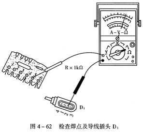 把萬用表選擇旋鈕撥到RR×1kΩ檔位,表筆不分紅、黑,一個分別測D1上的插腳4、1、2、3,另一個表筆分別對應測線路板上的3點、2點、5點、1點焊點,表針都應指在滿刻度,如圖4—62所示。若實測的情況與上述相符,說明焊點、導線、插頭都沒有問題,否則表明有斷線、接觸不良或虛焊等情況。