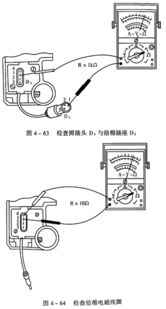 把萬用表的選擇旋鈕撥到R×1kΩ的檔位上,一個表筆測插孔4,另一個表筆測插孔1,如圖4—64所示。若這時測得的阻值為140Ω左右,說明給棉電磁線圈是好的,否則可能有斷路或接觸不良等情況。