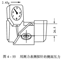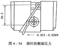 探針對罩殼左側槽壁的壓力來源于探針永久磁鐵對控制探針線圈鐵框架吸力的大小。按規定,在探針的26.5mm處,其壓力應為0.023~0.028N,如圖4—54所示。這個壓力可用測力表(測克計)測量確定,如圖4—55所示。但一般轉杯紡紗廠是不具備這個條件的。檢修紡紗器時,一是憑經驗,二是與新的紡紗器上罩殼做對比進行調整,其效果也能滿足生產要求。