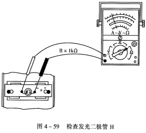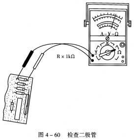 把萬用表選擇旋鈕撥到R×1kΩ的檔位,黑表筆與二極管的正極搭接,紅表筆與二極管的負極搭接(二極管負極一般都有一色圈標記),電阻值約在8kΩ,如圖4—60所示;若把兩表筆對調后再測量,表針基本在“田”位置,均說明二極管是好的。