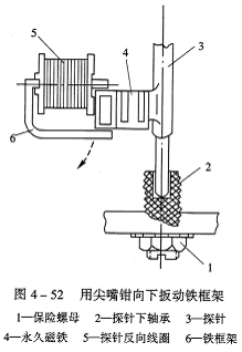 (4)探針永久磁鐵下端面與鐵框架發生摩擦:解決方法是把上罩殼后蓋拆下,用尖嘴鉗把鐵框架向下扳動少許,如圖4—52所示,扳動時用力不能太猛,以防止損壞其他機件。