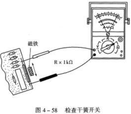 檢查時把選擇旋鈕撥到RXlkΩ檔位,表筆不分紅、黑,分別與干簧開關的兩端金屬腳搭接,如圖4—58所示。若表針一開始停留在“∞”處,用磁鐵靠近干簧開關并左右擺動,表針亦會跟隨磁鐵左右擺動,說明干簧開關沒有問題;若表針總指在“田”位置或者未用磁鐵靠近干簧開關而表針已指在滿刻度(0值),說明該干簧開關已損壞,需換新干簧開關。