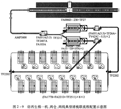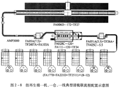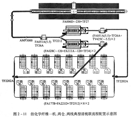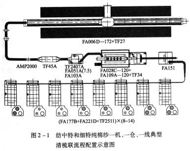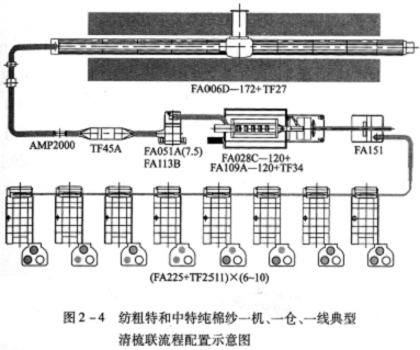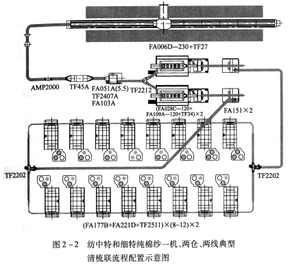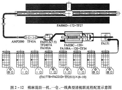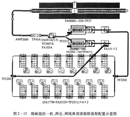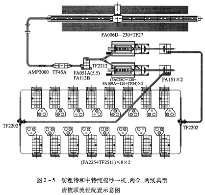 FA006D-230型往復抓棉機(附TF27型橋式磁鐵)→AMP2000型金屬火星探除器→TF45A型重物分離器→FA051A(5.5)型凝棉器+FAll3B型單軸流開棉機→TF2212型兩路配棉器→[FA028C-120型多倉混棉機+FAl09A-120型三輥筒清棉機(附TF34型磁鐵裝置)]×2→FAl51型除微塵機×2→TF2202型配棉三通×2→(FA225型梳棉機+TF2511型圈條器)×8×2。