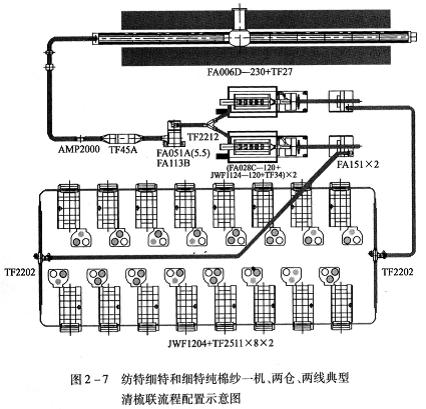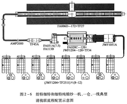 FA006D~230型往復抓棉機(附TF27型橋式磁鐵)→AMP2000型金屬火星探除器→TF45A型重物分離器→FA051A(5.5)型凝棉器+FAll3B型單軸流開棉機→TF2212型兩路配棉器→[FA028C-120型多倉混棉機+JWFll24—120型單輥筒清棉機(附TF34型磁鐵裝置)]×2→FAl51型除微塵機×2→TF2202型配棉三通×2→(JWFl204型梳棉機+TF251l型圈條器)×8×2。